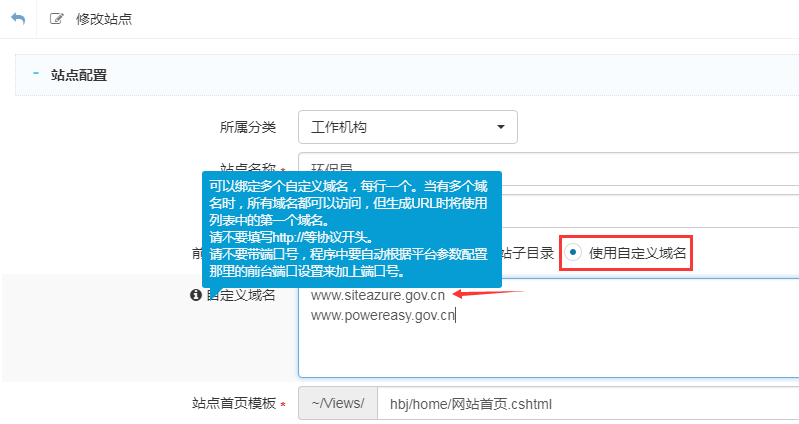 问题分析:SiteAzure里,子站可以使用自定义域名,也可以绑定多个自定义域名,当绑定多个子域名的时候,以列表中的第一个域名生成前台URL。
