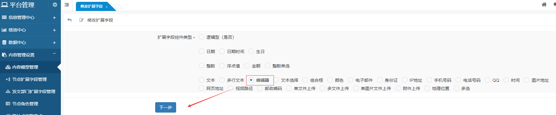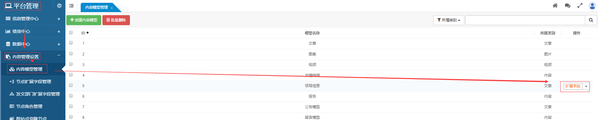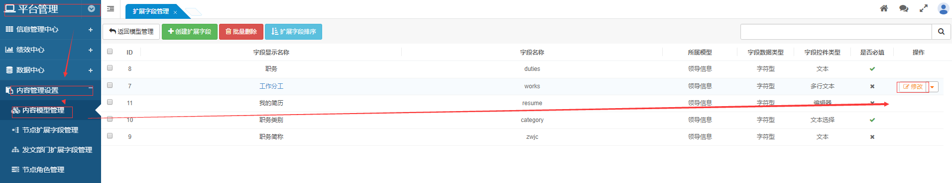 1、在平台管理-内容管理模型,点击领导信息的扩展字段