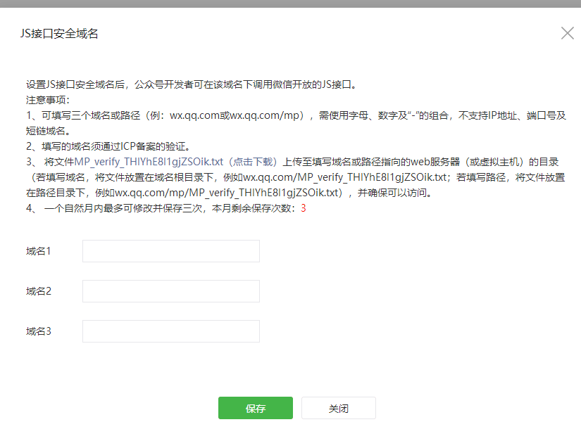 先在公众号平台下载一个验证的文本文件,把下到的文本文件放到网站的根目录或者新建一个文件夹放文件,再在微信公众号指定处填写域名,添加的域名就是你文本放的位置