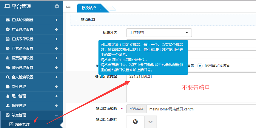解决方案: site.config的配置保持不变,平台的站点管理的自定义域名填入的IP不要加端口号。