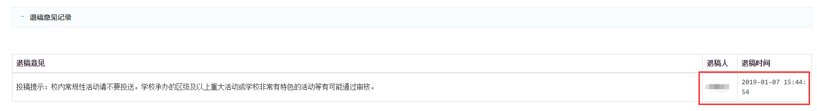 问题描述:推送到平台中心的内容,被退稿,怎么查看退稿原因? 问题分析:进入我的工作—内容管理—被退回的稿件,点击被退稿的文章标题,进入详细页面,即可看到退稿意见。
