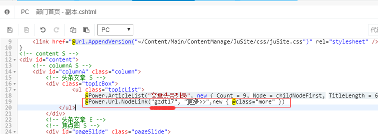 解决方案:页面对应的模板对应的位置添加代码 @Power.Url.NodeLink("gzdt17", "更多>>",new { @class="more" })。
