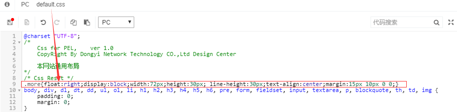 模板调用的CSS文件中,添加根据实际需求添加的CSS代码.more{float:right;display:block;width:72px;height:30px; line-height:30px;text-align:center;margin:15px 10px 0 0;},当然,样式也可另写。