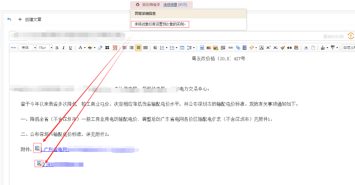 经检查发现是由于复制过来的内容含有编辑器识别不了的编码,如上图所示,两个word文档的图标在编辑器识别不了,导致无法保存上传内容,去掉该图标即可正常保存上传