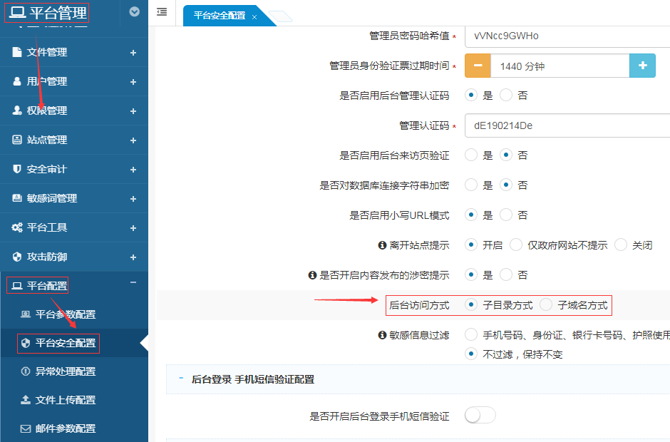 问题解决:2.1版本之后增加可以以子目录方式访问站点后台。平台管理—平台配置—平台安全配置,后台访问方式设置为“子目录方式”即可。