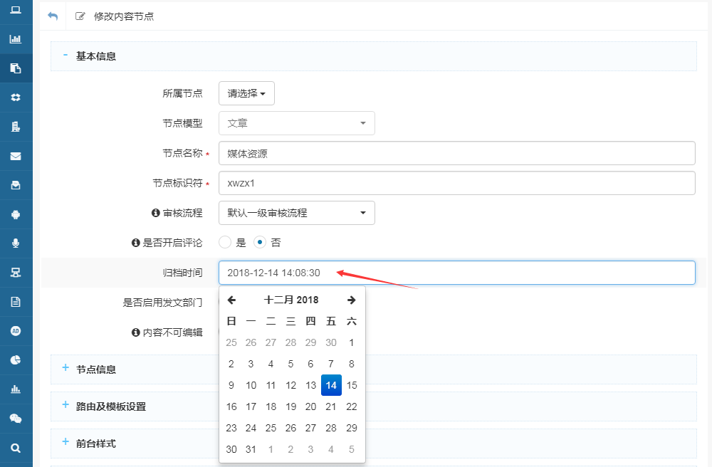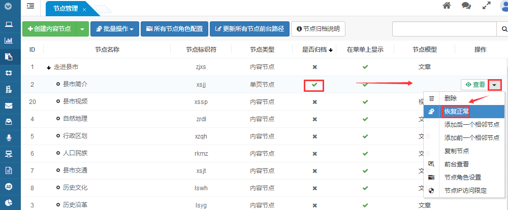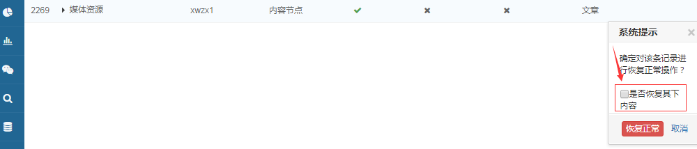 已经归档的栏目,可点击【恢复正常】按钮进行取消归档,并按照需求选择是否同时恢复节点下的内容。