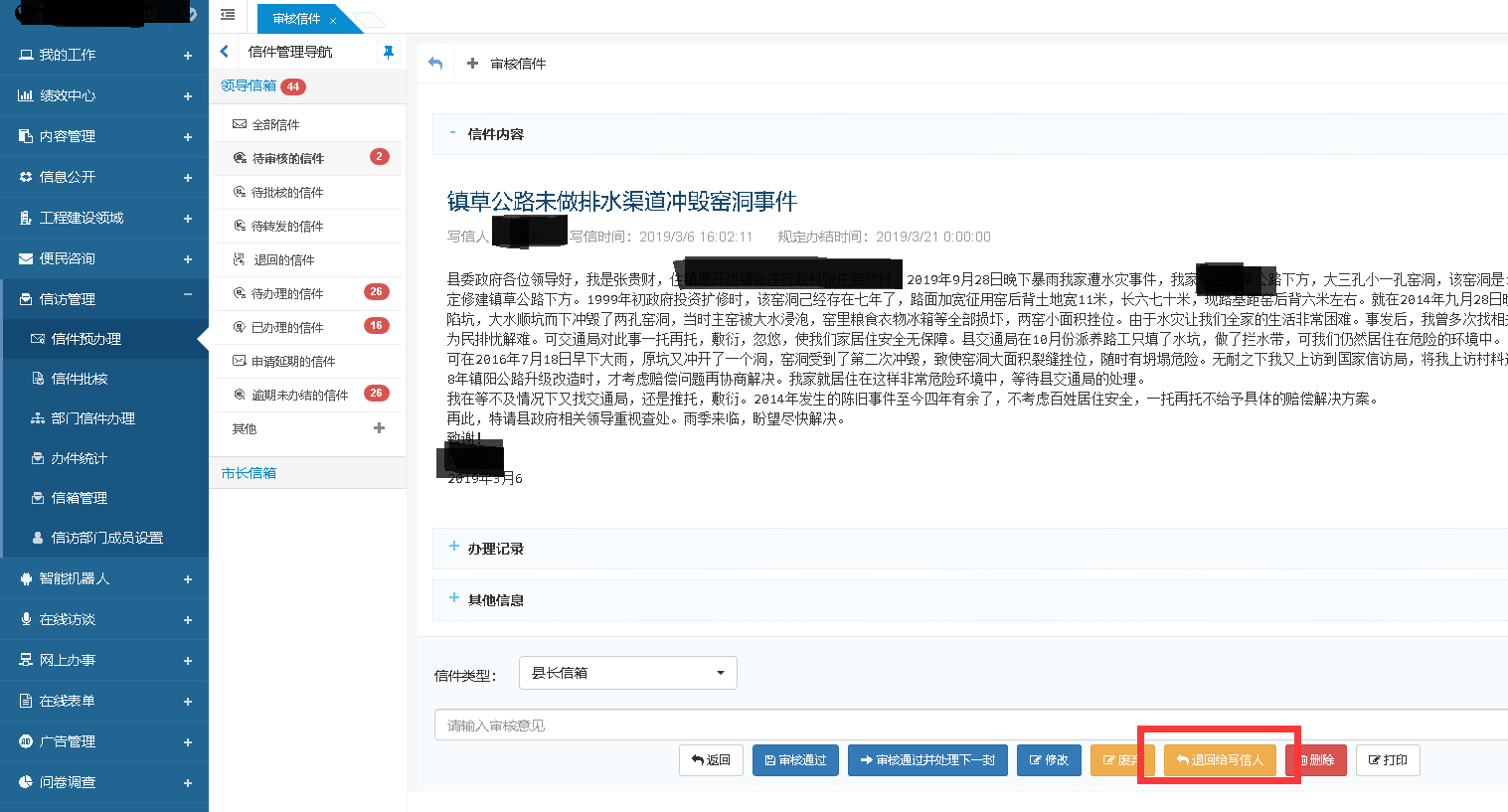 信访信件需要退回给写信人,在后台信件列表中点击信件标题进入详情页面,直接点击退回给写信人。