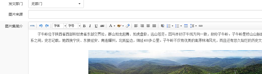 在图集模型的文章内容页中,后台编辑文章,在图片集简介下面可以看到文本加图片正常