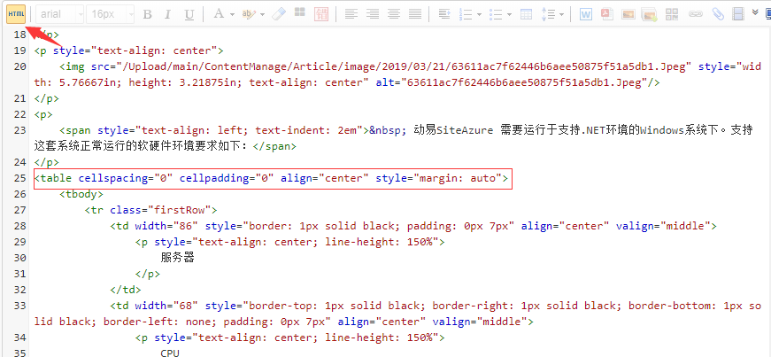 解决方案:点击HTML,找到表格源代码table,给table加上 style="margin:auto" 样式,前台表格居中显示。