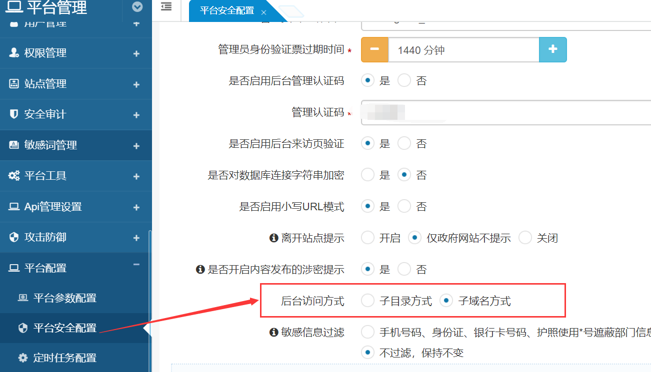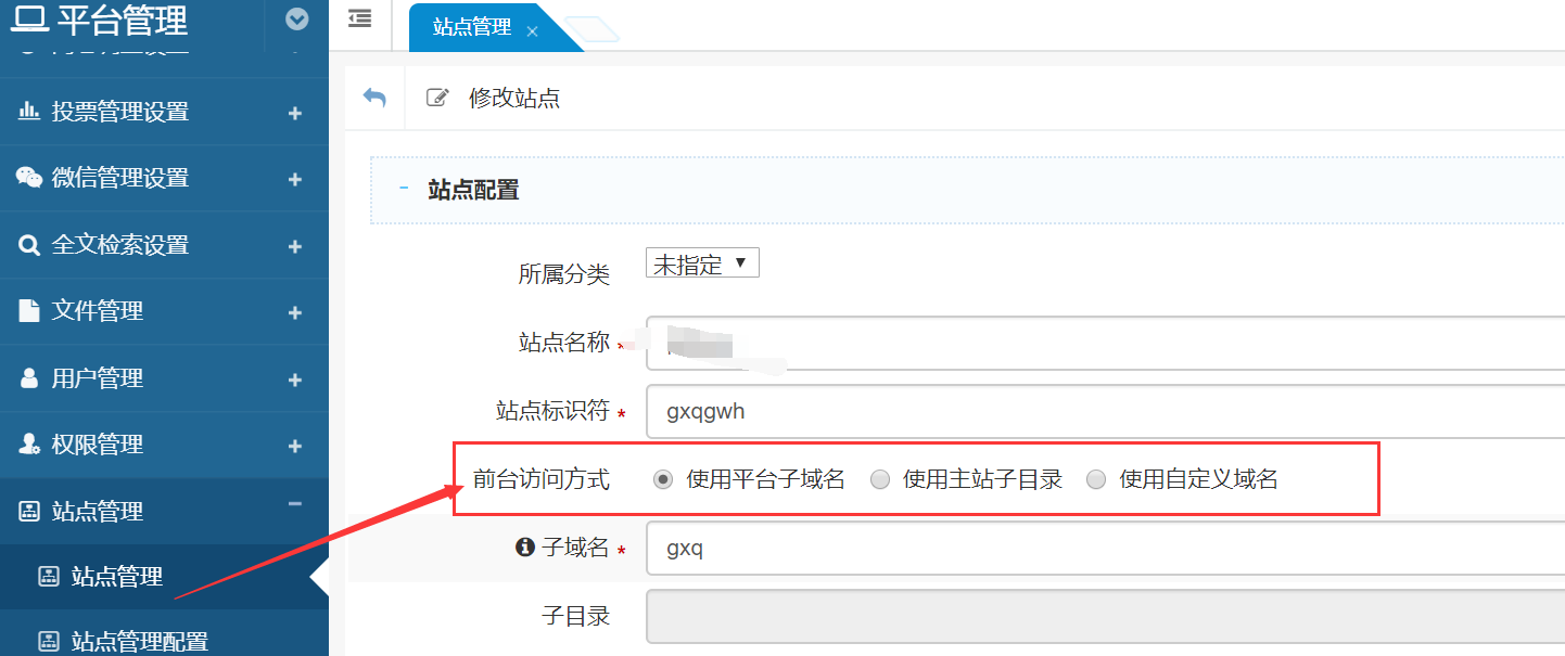 后台管理,可以设置“子目录方式”、“子域名方式”,如下图: