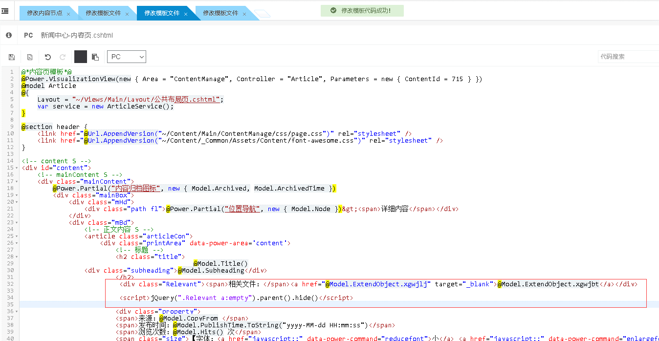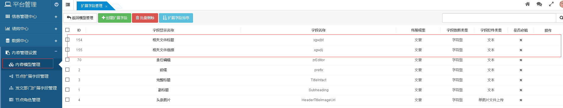 首先在平台管理--内容管理设置--内容模型管理中,找到文章模型的扩展字段,添加“相关文件标题”和“相关文件链接”两个扩展字段,如下图: