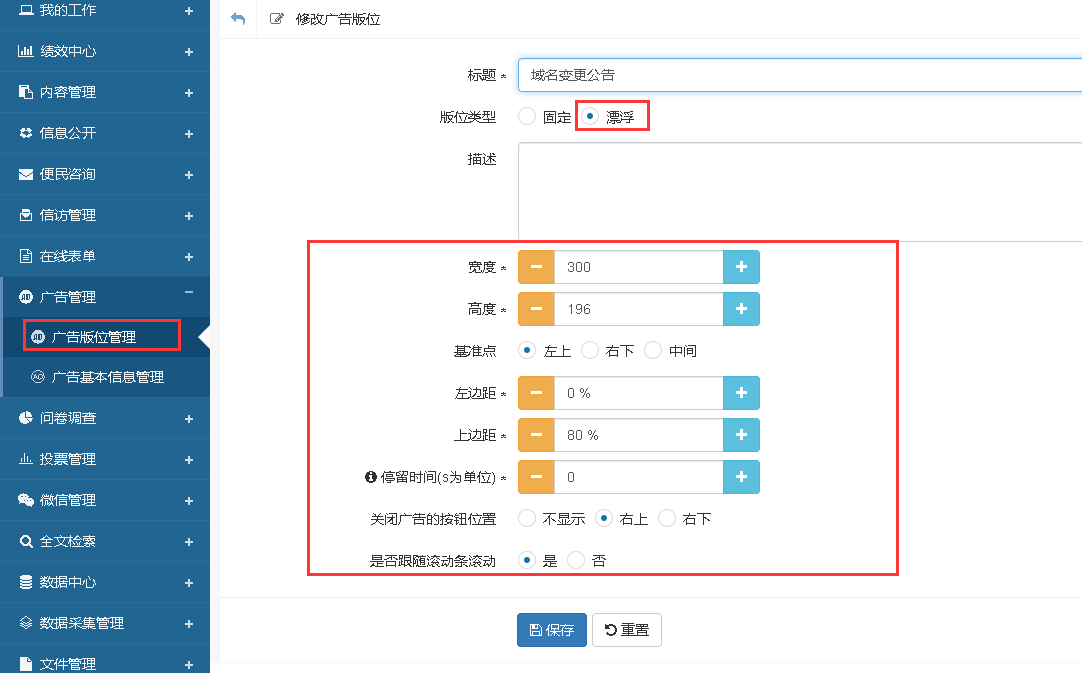 1、添加一个漂浮类型的广告版位,高度宽度、边距可以先估计一下,后面不合适可以修改的