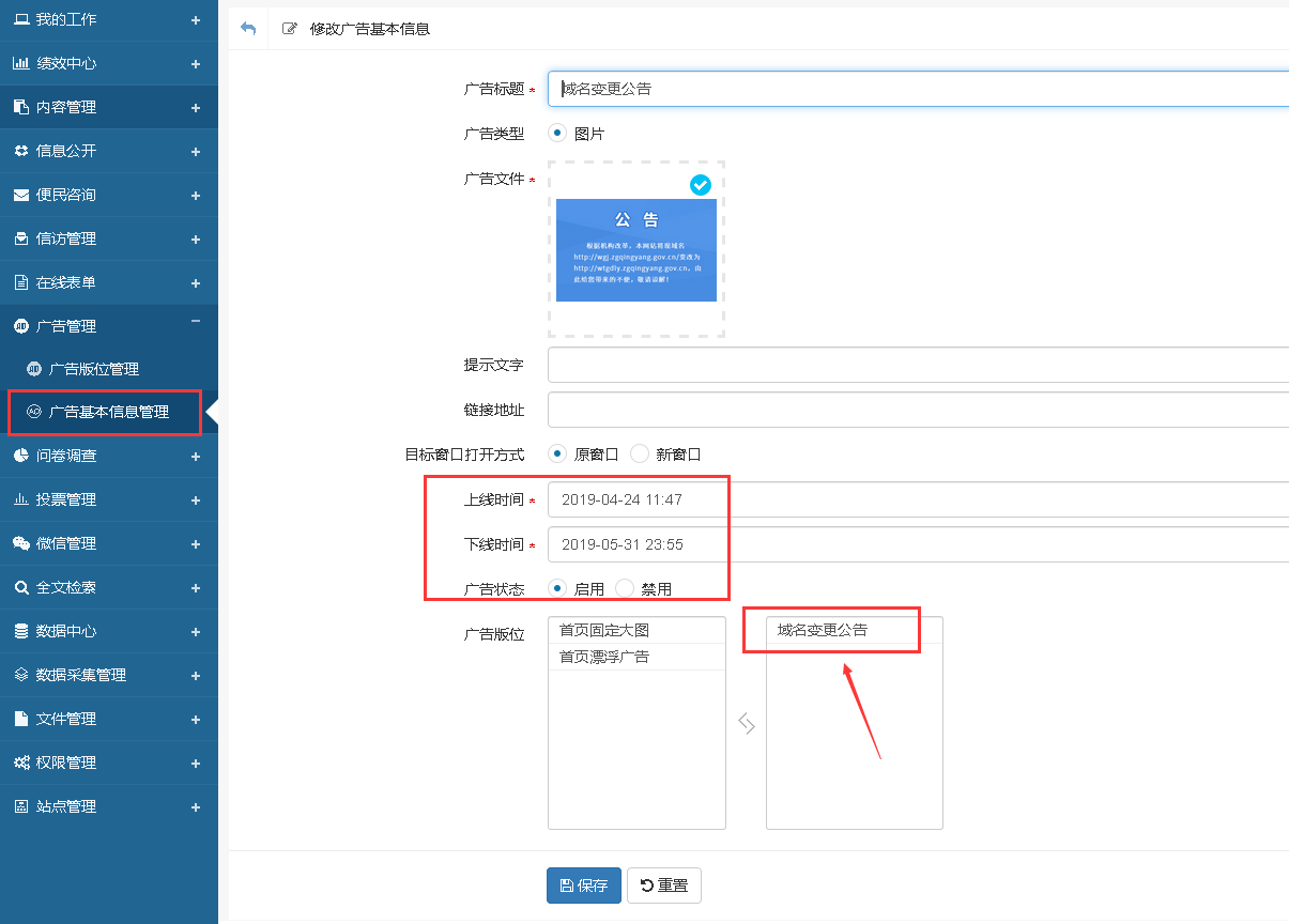 2.添加广告内容,主要就是上传图片、广告状态要开启,对应广告版位