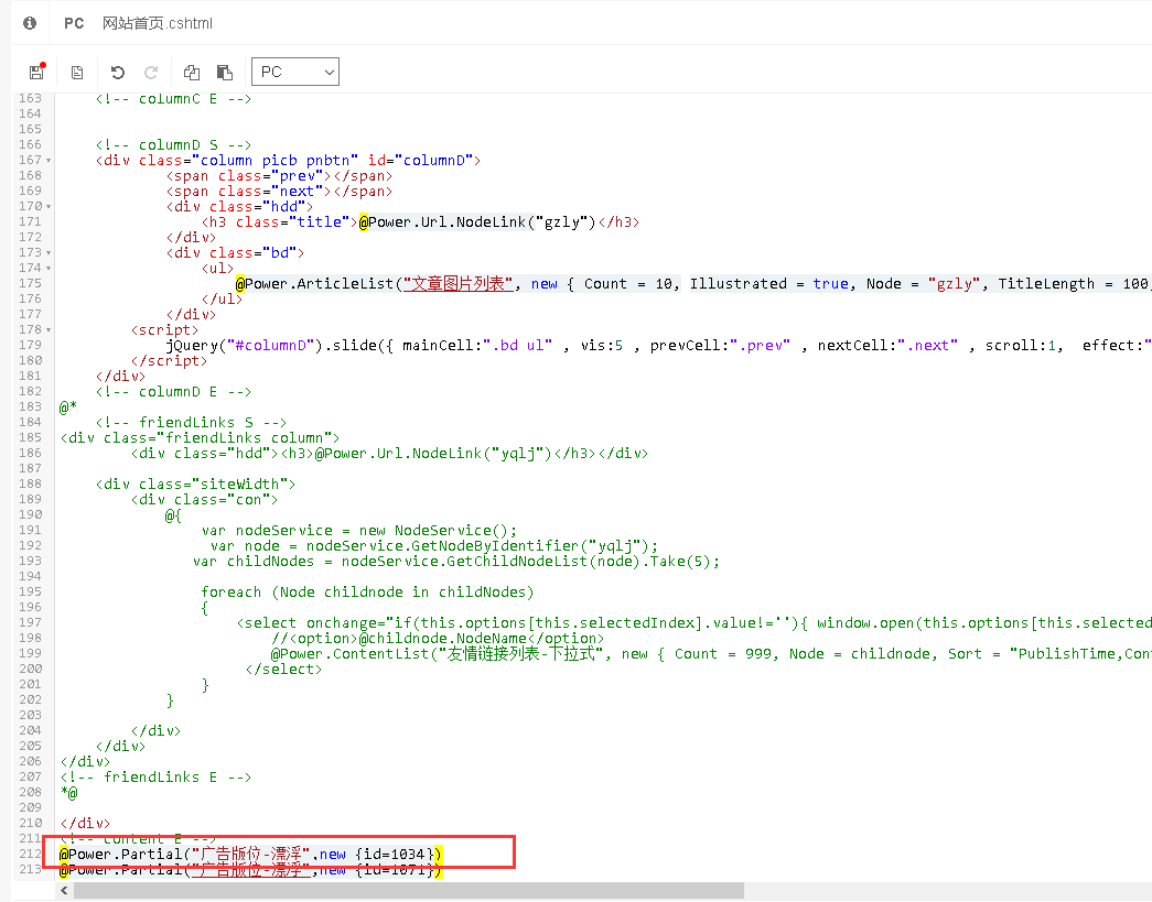3.模板中调用代码,@Power.Partial("广告版位-漂浮",new {id=广告版位ID})