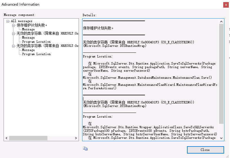 问题分析:创建维护计划,到最后一步保存的时候报错,sql错误日志如下: