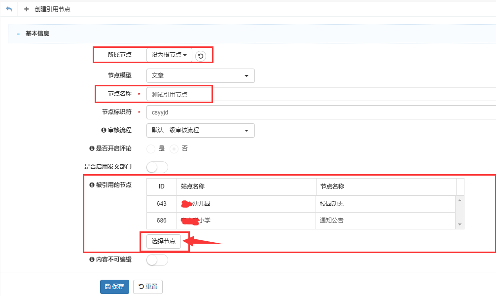 基本需要配置好的有【所属节点】、【节点名称】,在【被应用节点】处点击【选择节点】,按需选择多个站点多个节点;