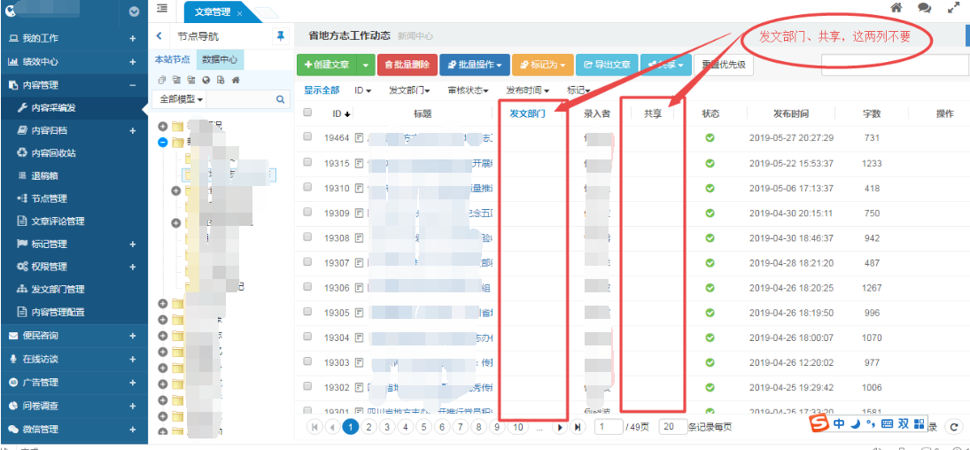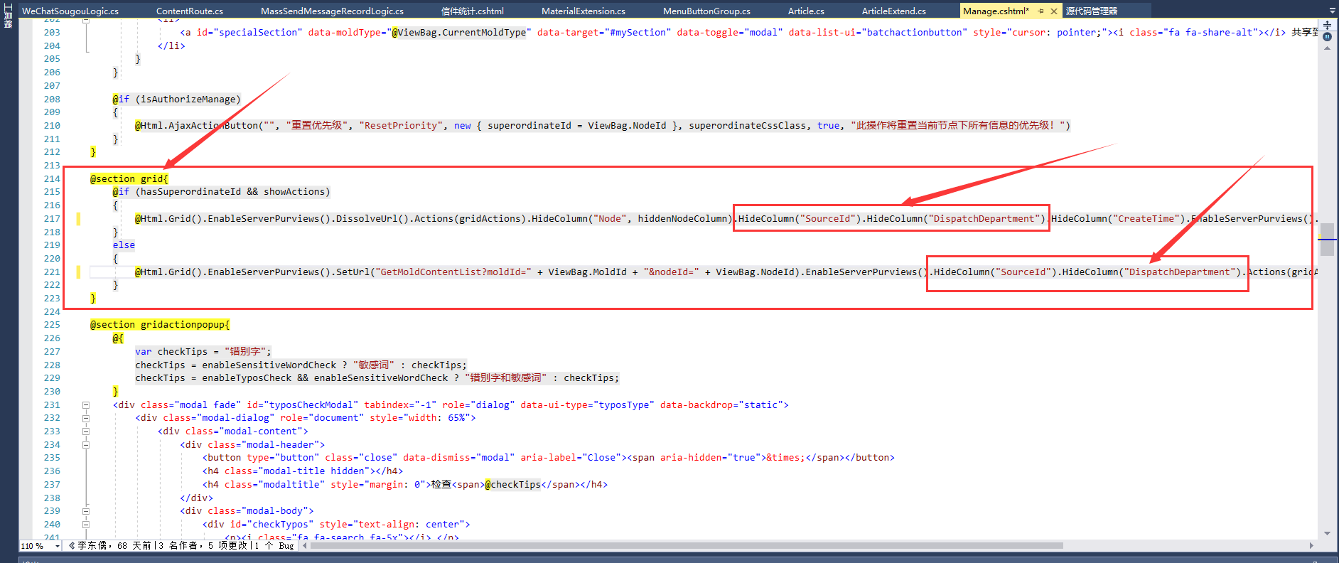 上图是该列表所在的页面,后台页面一般在Admin/Views/里,然后去对应的模块下面的结构去找。然后找到“@section grid{...}”添加“HideColumn("属性名")”就行。