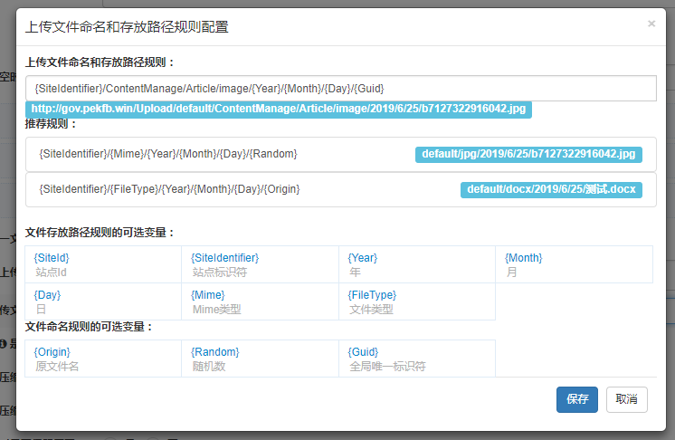 如何修改默认上传的命名规则 来源:本站原创 点击数: 次 发布时间:2019年06月25日 问题:如何修改默认上传的命名规则 解答:切换到平台管理--内容管理配置--点击需要修改的上传位置--点击上传文件规则--修改