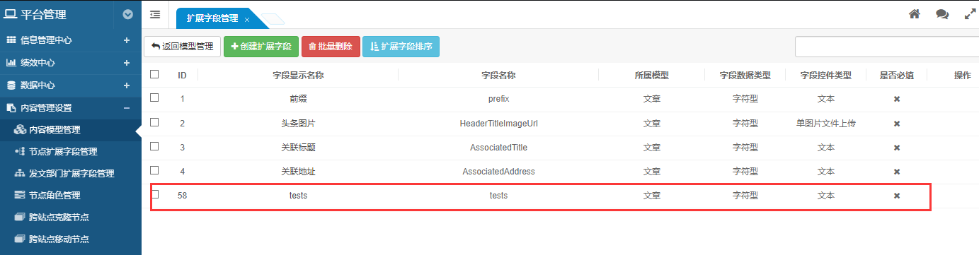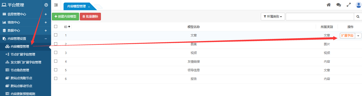 在平台管理,内容模型管理,找到文章模型,点击扩展字段。