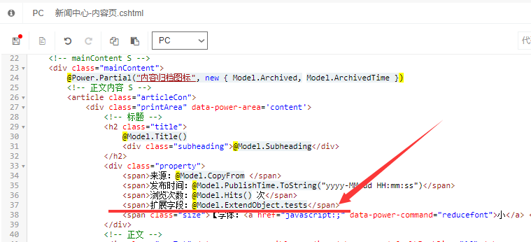 我们在其对应的模板加上调用代码“@Model.ExtendObject.tests”,然后保存进行数据测试。