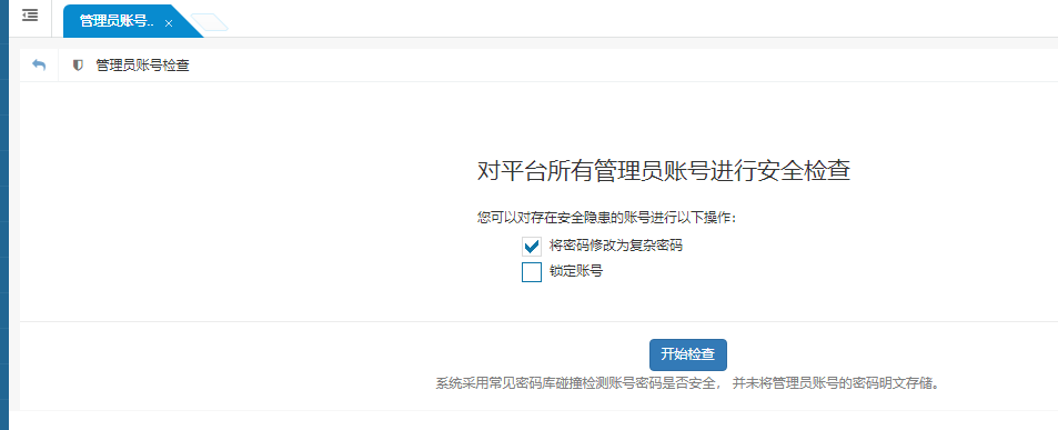 1.在平台管理--安全审计--管理员账号检查,点击开始检查,如下图: