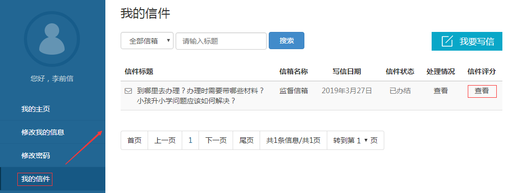 信件办结之后,前台用户登录会员中心,打开我的信访件,可点击“查看”按钮进行评分。