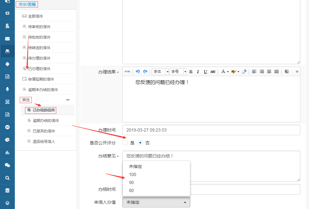 信箱管理员进入“信件预办理”打开相应信箱,点开“其他”,进入“已办结的信件”界面,可对信件进行修改,选择是否公开评分,也可修改来信人分值。