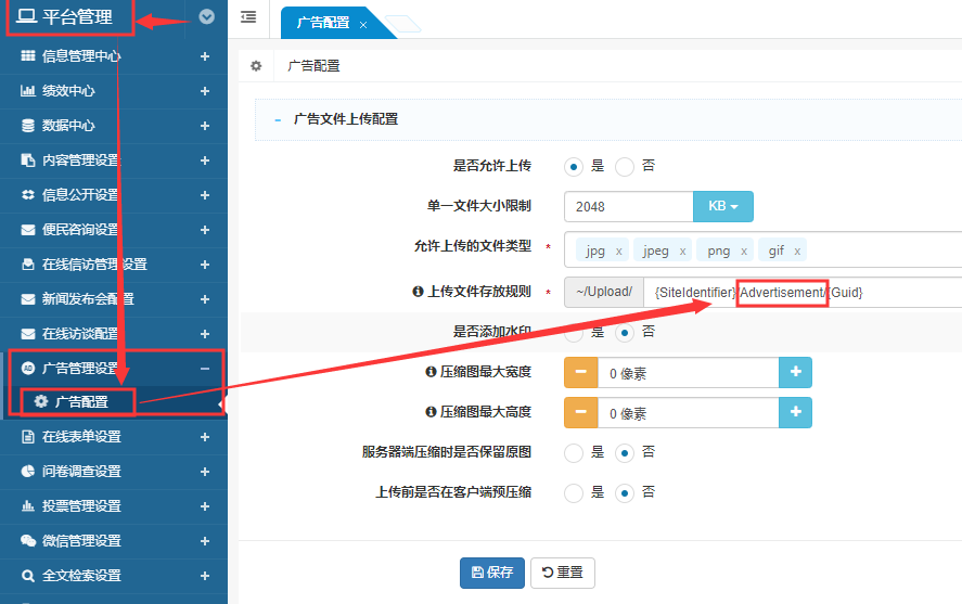 第一:上传文件存放规则路径中的advertisement改成其他的单词;