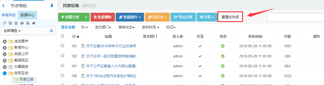 问题分析:前台文章置顶,默认除了更新时间决定之外,还可以通过配置“优先级”使文章置顶。优先级配置多了,容易混淆,节点全部文章优先级归零如何做呢?
