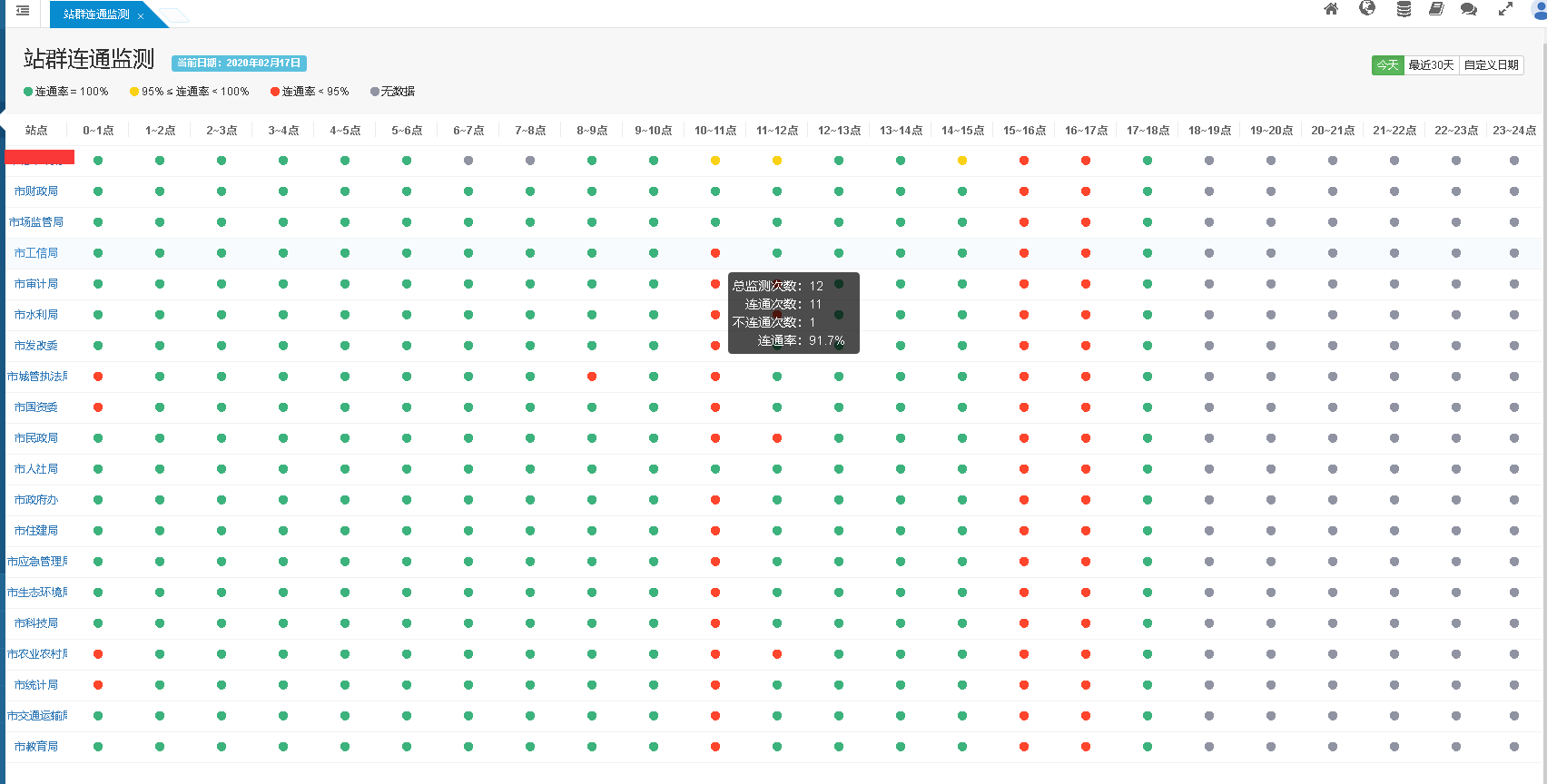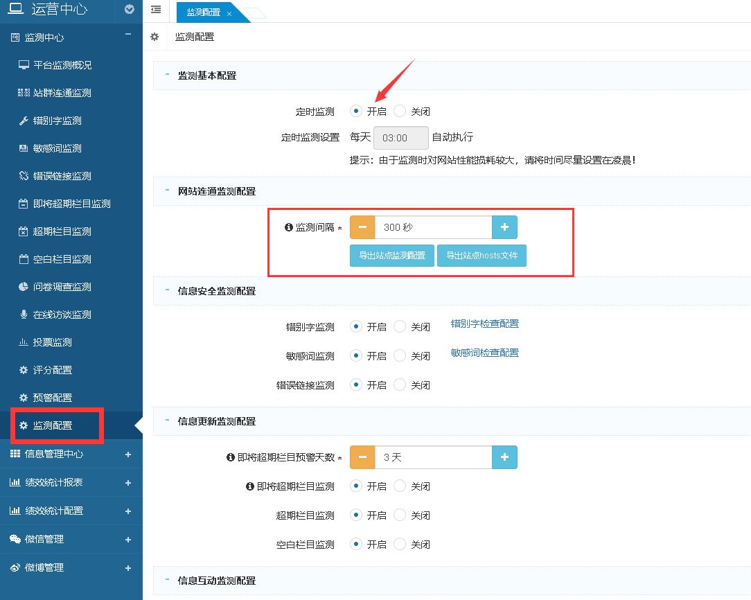 <p style="text-indent:2em;">1.首先在运营中心--监测中心--监测配置中进行监测的相关配置;</p> <p align="center"><img align="" alt="" border="0" height="639" src="$/History/tech/uploadfiles/help/2020/2/202002171756413778.png" width="800" /></p> <p style="text-indent:2em;">2.在站群连通检测下面即可看到当天0-24时或者右上角自定义时间段内的连通详情;</p> <p align="center"><a href="$/History/tech/uploadfiles/help/2020/2/202002171758432216.png"></a></p>