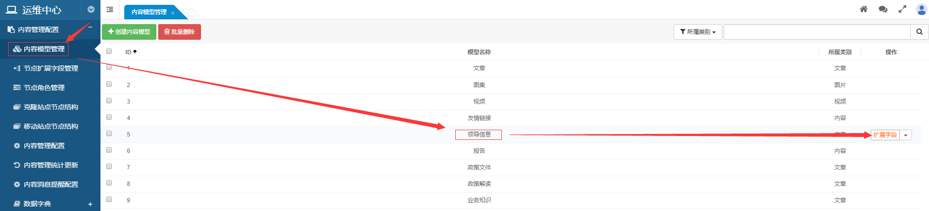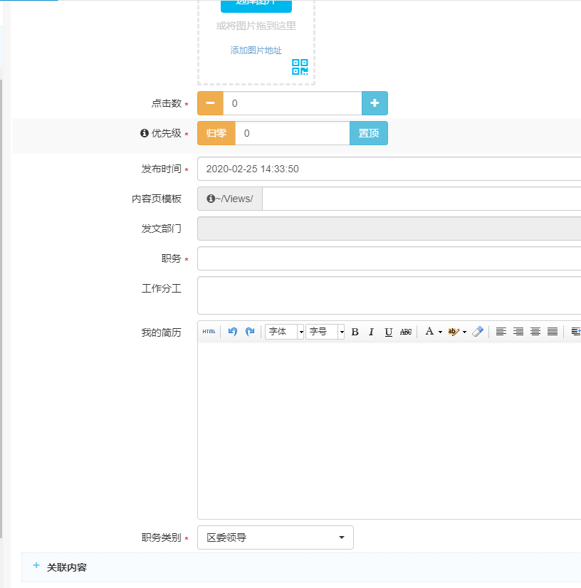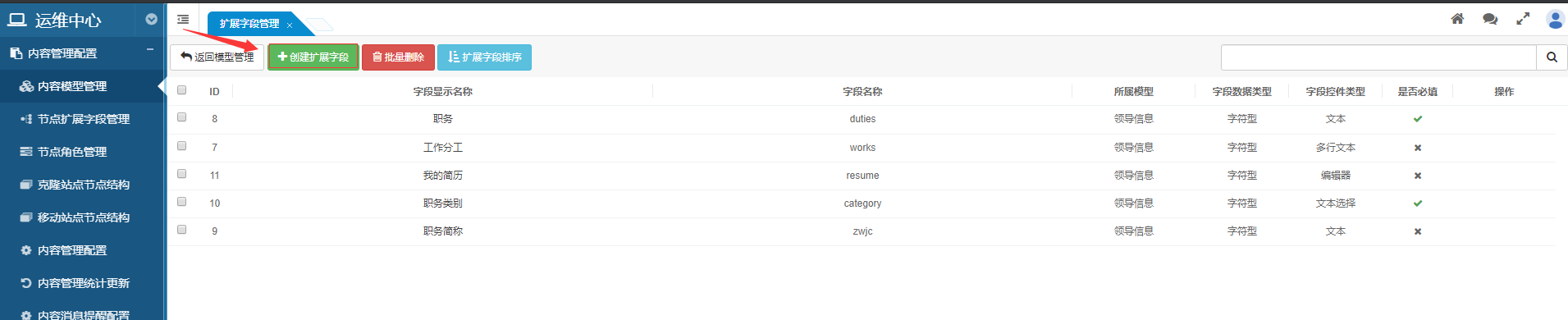 6、需要注意的是,领导模型并不像文章模型一样,添加完扩展字段在后台自动显示出来,这个还需要到服务器上修改相应的视图文件