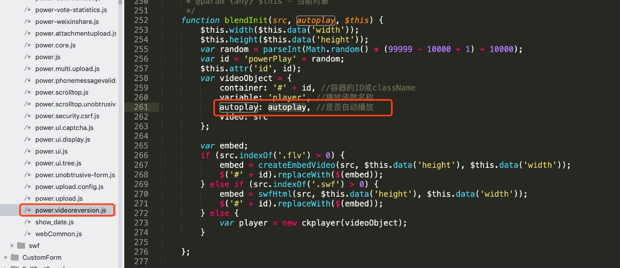问题解决:打开/content-/common/base/js找到power.videoreversion.js将下图中的auto:play设置为false保存即可。