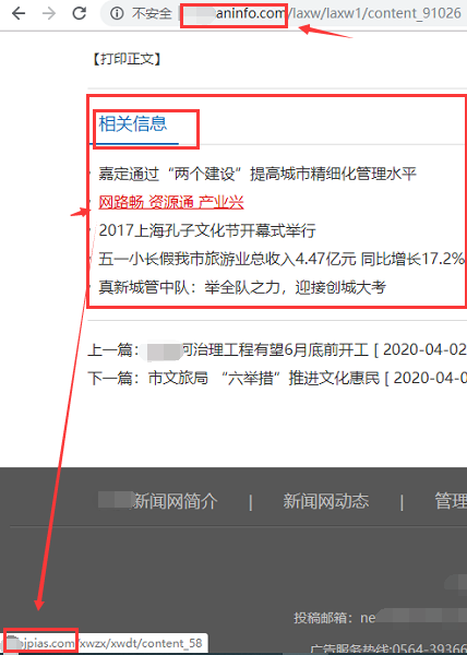 问题描述:栏目节点开启自动补齐相关内容功能,文章内容页页下面看到相关信息指向另一个域名已经停止解析的站点。