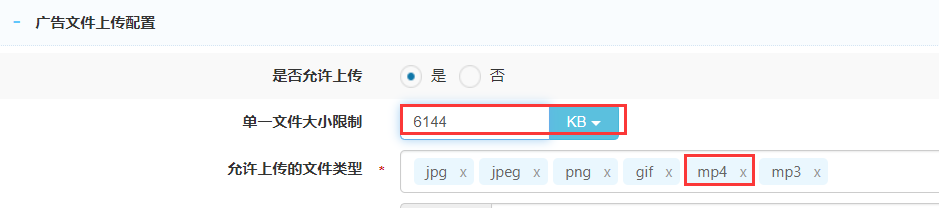 2.在‘运维中心--广告管理--广告配置’中设置文件上传大小,类型。(类型添加:mp4(本地上传视频需设置文件大小))