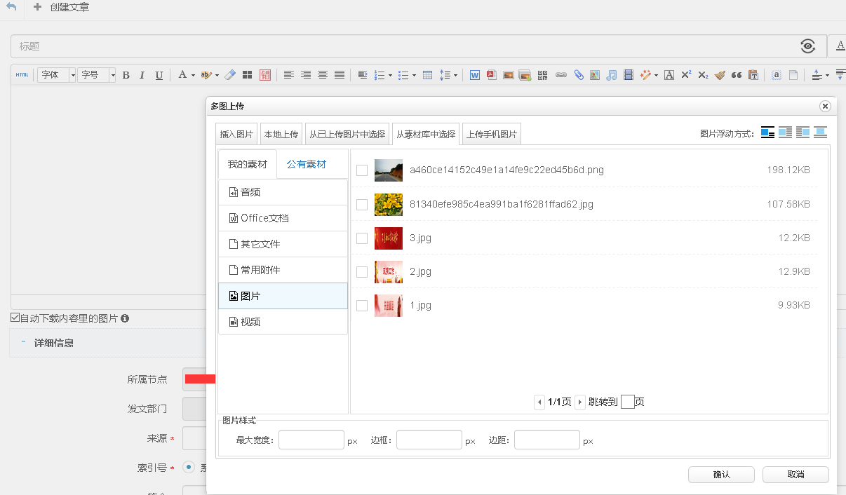 3.上传图片时可直接通过多图上传按钮,从素材库中选择上传;