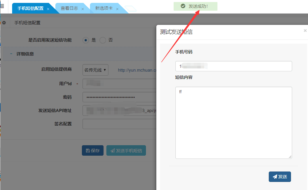 问题分析:经过测试,这个是由于名传无线平台要求发送短信时必须要有签名配置