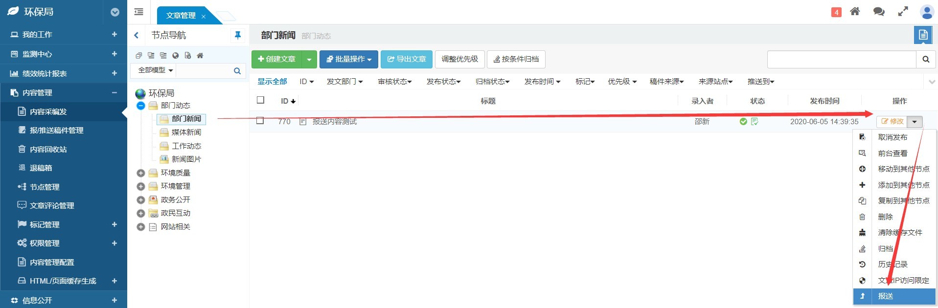 如上图,我们切换到一个有报送/推送权限的子站,选择一篇已经发布的内容,点击修改扩展按钮里面的推送。
