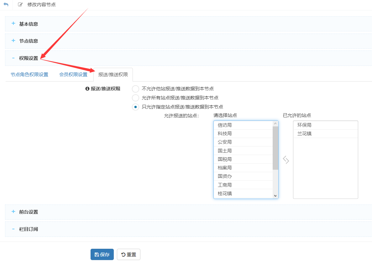 如上图,我们首先在主站挑选一个栏目,作为子站报送数据的栏目,点击栏目修改,在权限设置,报送/推送权限,可以点击许可所有站点报送/推送数据到本节点,也可以选择只允许指导站点报送/推送数据到本节点,并且选顶好许可的站点,点击保存。到此这个栏目就设置完成了。
