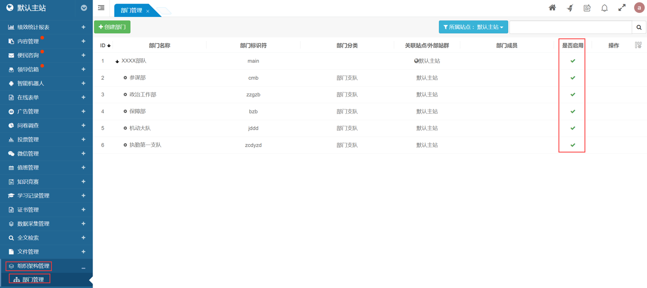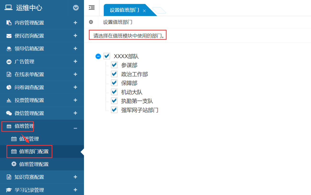 <div style="text-align: left"><p style="text-align: left"><strong>问题描述:</strong>在组织架构中已经添加了部门,但是值班部门没有显示。</p><p style="text-align: left"><strong>解决方案:</strong></p><p style="text-align: left">1、查看部门是否启用</p><p style="text-align: left"><img src="$/tech/contentmanage/article/image/16bc508266a94d5fa53dadb8671270ca.png" alt="" width="800" height="356" class="none" style="text-align: left; max-width: 100%"></p><p style="text-align: left">2、运维中心-值班管理-值班部门配置,选择在值班模块中使用的部门。</p><p style="text-align: left"><img src="$/tech/contentmanage/article/image/a052a2e7c49b4e7e8b6395841982ce9e.png" alt="" width="554" height="347" class="none" style="text-align: left; max-width: 100%"></p></div>