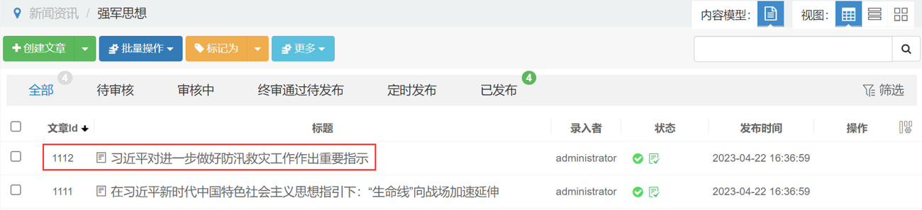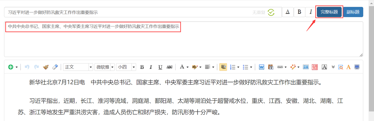 <div style="text-align: left"><p style="text-align: left"><strong><span style="text-align: left">问题描述:</span></strong>文章在前后台显示的标题不一致。</p><p style="text-align: left">前台:</p><p style="text-align: left"><img src="$/tech/contentmanage/article/image/4d29e9b6ff8b4e70b467398d8bb22eb5.png" alt="" width="554" height="197" class="none" style="text-align: left; max-width: 100%"></p><p style="text-align: left">后台:</p><p style="text-align: left"><img src="$/tech/contentmanage/article/image/6bbd99f1540a4f0fbafbf3d07e380b7f.png" alt="" width="554" height="126" class="none" style="text-align: left; max-width: 100%"></p><p style="text-align: left"> </p><p style="text-align: left"><strong><span style="text-align: left">解决方案:</span></strong>文章设置了完整标题,前台将会显示文章的完整标题。</p><p style="text-align: left"><img src="$/tech/contentmanage/article/image/c6e13797467e44c6b197fd7ba11c3f72.png" alt="" width="554" height="179" class="none" style="text-align: left; max-width: 100%"></p></div>