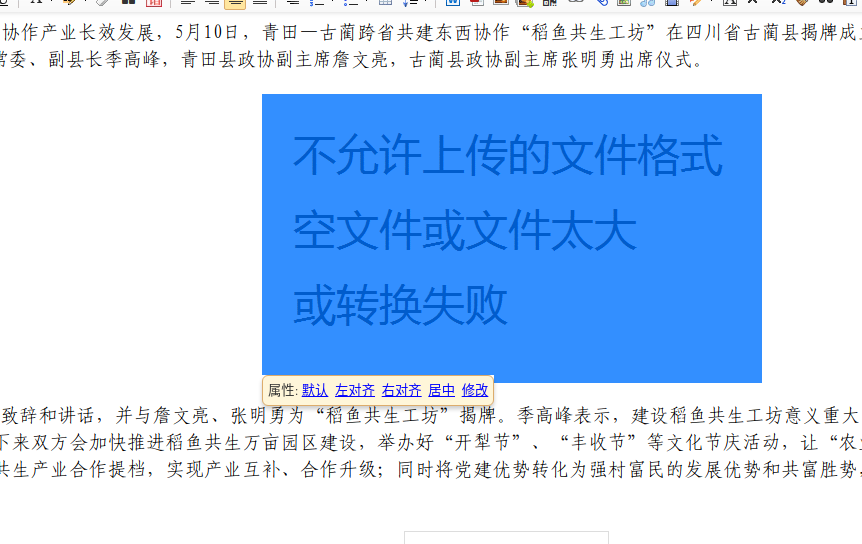 问题描述:后台内容中图片无法显示,提示不允许上传的文件格式空文件或文件太大或转换失败