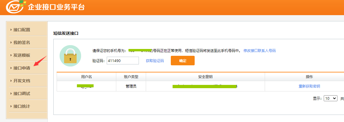2.选择“接口业务”-“接口申请”,获取手机验证码后可查看“安全秘钥”;