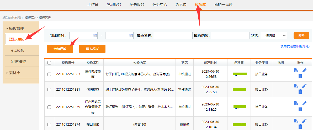 4.发送测试短信会提示失败,发送内容与模板不符,需要在短信平台中配置常用模板;
