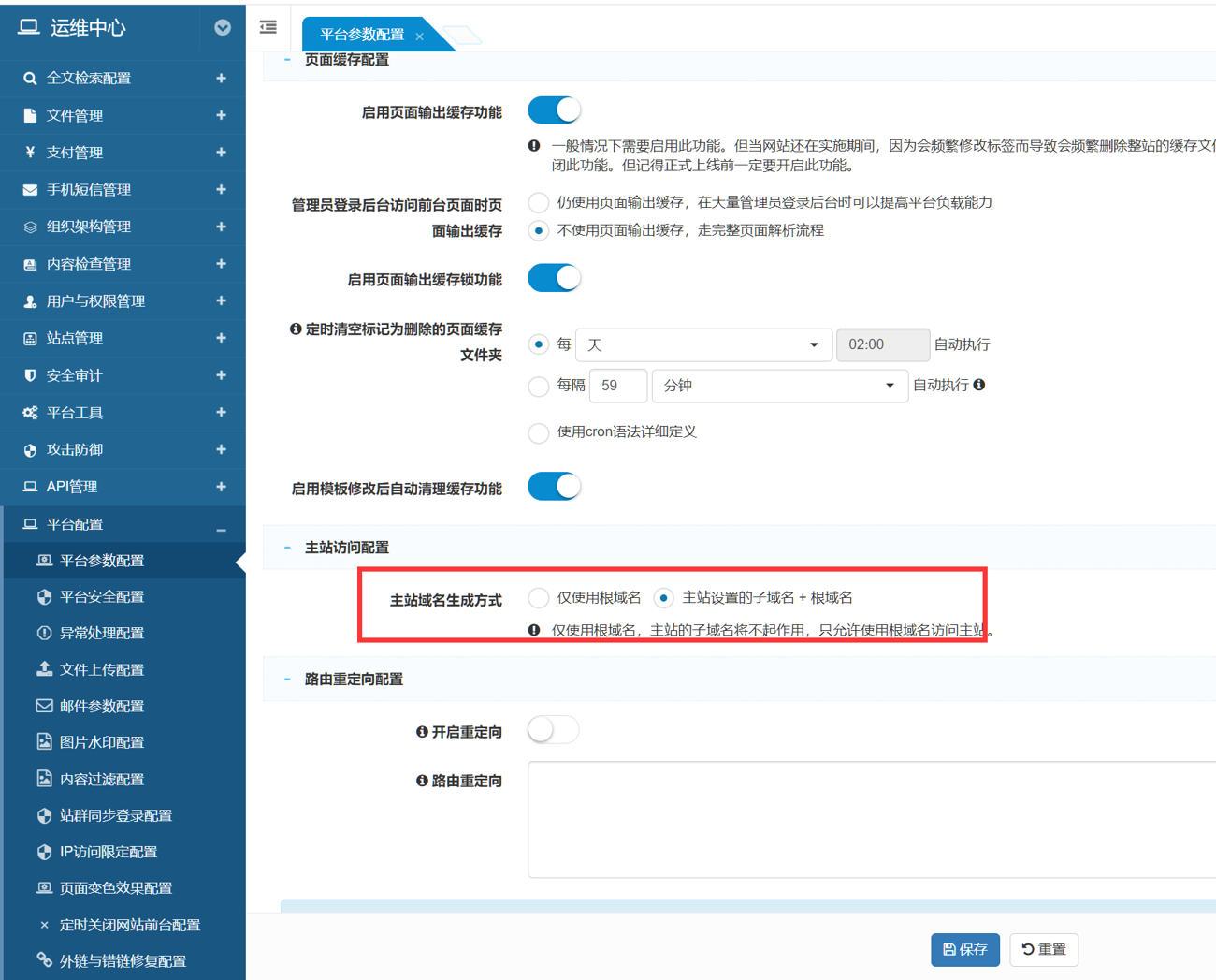 问题:切换运维中心后,访问地址自动添加www地址 解决:运维中心-平台设置-平台参数配置--主站访问配置--修改为“仅使用根域名”