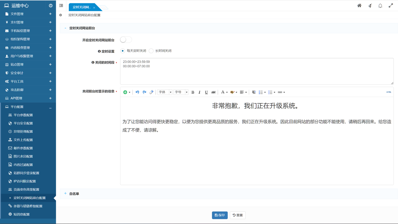 <p style="text-align: left">问题:如何设置定时关闭前台</p><p style="text-align: left">解决:运维中心--平台配置--定时关闭网站前台配置--开启定时关闭网站前台,然后设置关闭的时间段,然后设置前台关闭需要显示页面即可<span class="image-container " eid="eid_363873a6fa62"> <img src="$/tech/contentmanage/article/image/313219e4fd3040afa92504b605612cbc.png" eid="eid_363873a6fa62" style="max-width: 100%"> </span> </p>