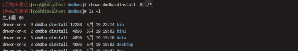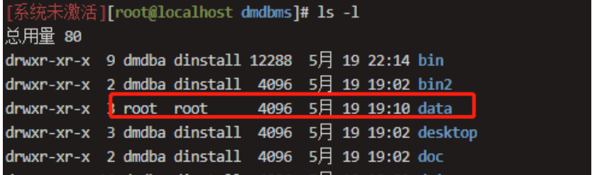 可以看到data目录的属组是root,而不是dmdba, 通过命令:chown dmdba:dinstall -R ./* 更改整个文件夹的属组: