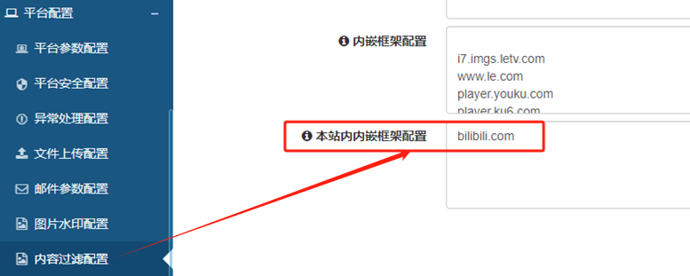 解决方案:【运维中心】-【平台配置】-【内容过滤配置】下的【本站内内嵌框架配置】填写入引用的第三方域名。