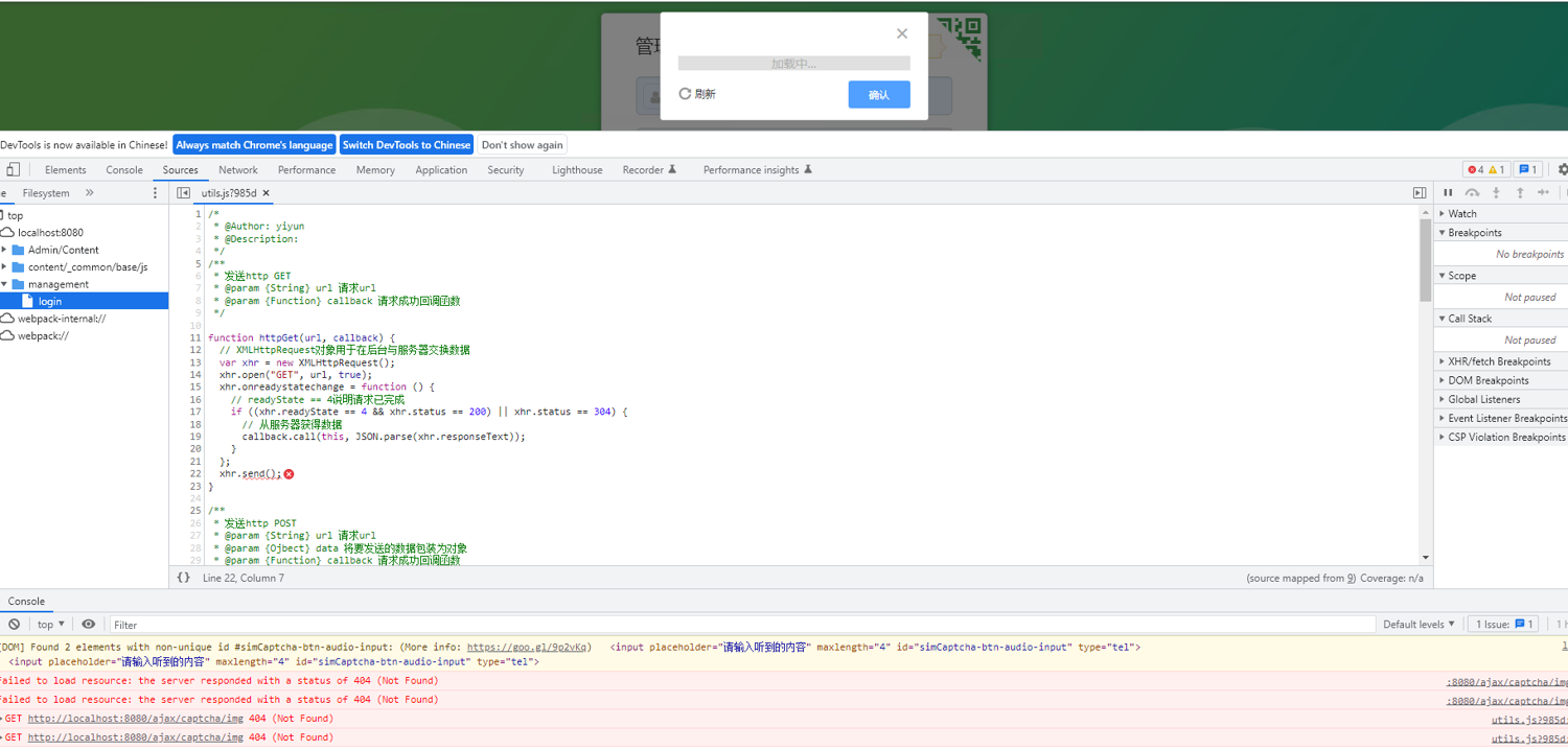 问题描述:正常后台账号输错三次后会弹出验证码,但此时验证码显示加载中,并且请求报错