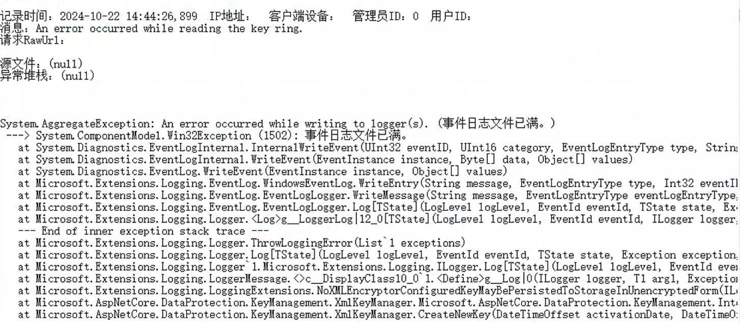 问题分析:网站访问提示遇到的System.ComponentModel.Win32Exception (1502)错误,提示事件日志文件已满,如下图: