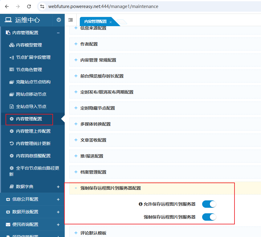 运维中心-内容管理配置-内容管理配置-强制保存远程图片到服务器-打开允许保存远程图片到服务器和强制保存远程图片到服务器